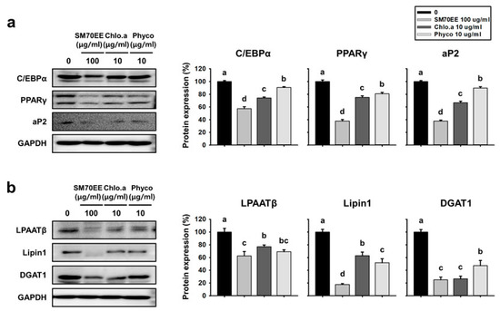 SM70EE, chlorophyll a, and C-phycocyanin reduce the expression of adipogenic and lipogenic proteins in C3H10T1/2 cells. (a) Western blots of adipogenic protein (C/EBPα, PPARγ, and aP2) expression after differentiation for 8 days. Quantification graphs for C/EBPα, PPARγ, and aP2 expression. (b) Western blots of lipogenic protein (SREBP1, LPAATβ, Lipin1, and DGAT1) expression in C3H10T1/2 cells. The specific bands were quantified and are presented as graphs. Data are expressed as mean ± SD (n = 3). Values with different letters are significantly different, p < 0.05 (a > b > c).