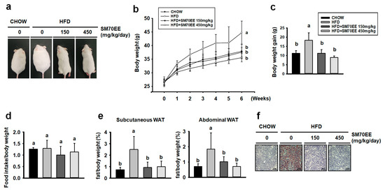 SM70EE ameliorates obesity in HFD-fed mice. (a) Representative image of the whole body. The effects of SM70EE on body mass (b), body mass gain (C), and food intake per unit body mass (d) were monitored for 6 weeks during treatment with SM70EE. (e) The mass of subcutaneous and abdominal fat depots per unit body mass are shown as graphs. (f) The effect of SM70EE on hepatic lipogenesis was assessed using oil red O staining. Mice were or were not administered with SM70EE (150 or 450 mg/kg/day) in their HFD for 6 weeks. Data are expressed as mean ± SD (n = 6). Values with different letters are significantly different, p < 0.05 (a > b).