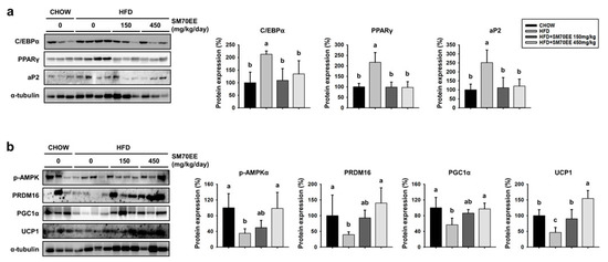 Treatment with SM70EE downregulates markers of adipogenesis and upregulates thermogenic markers in the WAT of HFD-fed mice. WAT from HFD-fed mice administered with SM70EE was analyzed for expression of adipogenic genes (a) and BAT-specific proteins (b). Specific bands were quantified and are presented as graphs. Mice were or were not administered with SM70EE (150 or 450 mg/kg/day) in their HFD for 6 weeks. Data are presented as mean ± SD (n = 6). Values with different letters are significantly different, p < 0.05 (a > b > c).