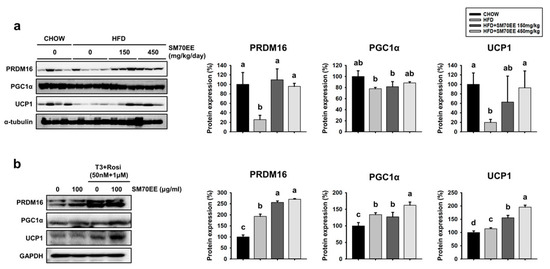 SM70EE administration upregulates thermogenic genes in BAT of HFD-fed mice and in inducible WAT cells. (a) BAT from mice treated with SM70EE was analyzed for the expression of BAT-specific proteins. (b) SVF cells were differentiated into white adipocytes, as described in the Materials and methods. Protein expression of browning factors was measured in primary WAT adipocytes. All data are presented as mean ± SD (n = 6). Values with different letters are significantly different, p < 0.05 (a > b > c > d > e).