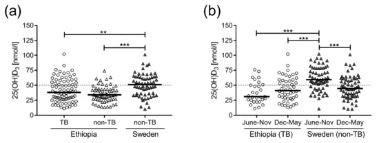 Plasma samples were collected from the study subjects and vitD3 status was determined by assessment of 25(OH)D3 concentrations in plasma using the DiaSorin assay conducted at the Chemical Laboratory, Karolinska University Hospital, Solna, Sweden. To demonstrate seasonality of vitD3 status, the 25(OH)D3 concentrations in TB patients and Swedish non-TB controls, were subdivided into two seasons: June–November and December–May. Ethiopian TB patients were sampled at the time of diagnosis, while longitudinal samples were obtained from the Swedish non-TB controls. Thus, matched samples were obtained from the Swedish non-TB controls in June–November (average 25(OH)D3 concentration from two samples per individual) and December–May (average 25(OH)D3 concentration from three samples per individual).