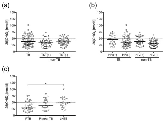 VitD3 levels in subgroups of Ethiopian TB patients and non-TB controls. Concentrations of 25(OH)D3 in plasma from (a) TB patients (circles) compared to non-TB controls (triangles) grouped into TST-positive (+) and TST-negative (−) individuals, (b) HIV-positive (+) and HIV-negative (−) TB patients (circles) and non-TB controls (triangles), (c) patients with pulmonary TB (PTB), pleural TB, or lymph node TB (LNTB). Data are presented in box plots with horizontal bars indicating the median. * p < 0.05. The dotted line is the threshold for VDD, 25(OH)D3 < 50 nmol/L.