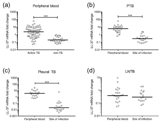 Peripheral and local mRNA expression of the antimicrobial peptide LL-37 in patients with active TB. Relative mRNA expression (median) of LL-37 in (a) peripheral blood (PBMCs) from active TB (PTB, pleural TB and LNTB) patients (circles) and non-TB controls (triangles), (b) in peripheral blood (PBMCs) compared to the site of infection (BAL cells) from patients with pulmonary TB (PTB), (c) in peripheral blood (PBMCs) compared to the site of infection (pleural fluid cells) from patients with pleural TB, and (d) in peripheral blood (PBMCs) compared to the site of infection (cells from lymph node tissue) from patients with lymph node TB (LNTB). Data are presented in box plots as a fold change LL-37 mRNA in TB patients normalized to non-TB controls. *** p < 0.001.