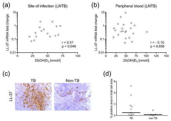 Local expression of LL-37 in patients with lymph node TB (LNTB). Correlation analyses were performed in order to assess the association between plasma concentrations of 25(OH)D3 and LL37 mRNA expression (a) at the local site of infection (lymph node tissue) and (b) in the peripheral blood (PBMCs) of patients with LNTB. (c) Representative immunohistochemical images show the expression of LL-37 in granulomatous lymph node tissue from a LNTB patient compared to a non-TB control (magnification × 125). Positive cells are depicted in brown, whereas negative cells were counterstained with hematoxylin in blue. (d) In situ computerized image analysis was used to determine LL-37 protein expression (median) in LNTB patients (n = 11) compared to non-TB controls (n = 5).