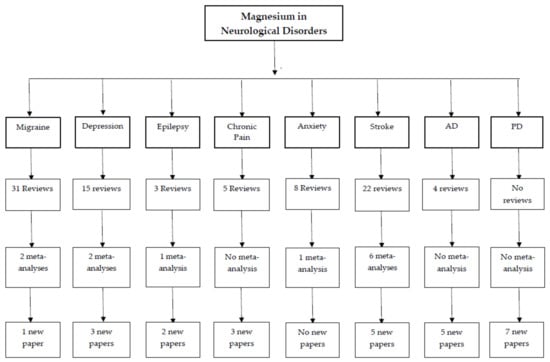 Flow chart of magnesium in neurological disorders literature. New papers refer to published research not included in previously-published reviews and meta-analyses. AD = Alzheimer’s Disease; PD = Parkinson’s Disease.