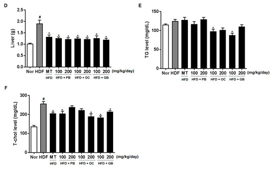In addition, PB, OC, and GB extract treatments attenuated the effects of HFD on the liver weight, with the weight restored to the normal control levels (Figure 2D). Therefore, PB, OC, and GB extract treatments significantly improved HFD-induced fatty liver and hepatomegaly.