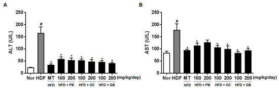 Effects of PB, OC, and GB extracts on serum alanine aminotransferase (ALT) and aspartate aminotransferase (AST) levels in HFD-fed mice. The serum ALT (A) and AST (B) levels were determined 14 weeks after PB, OC, and GB extracts treatment. The data are presented as the mean ± SEM (n = 9); # p < 0.05 compared with the control group; * p < 0.05 compared with the HFD group.