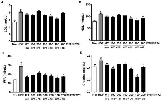 Male C57BL/6J mice were purchased from Dae Han Bio Link Co. (Eumsung, Korea). All mice were kept under controlled temperature (22 ± 1 °C) and humidity (55 ± 10%) on a 12 h light–dark cycle. For NAFLD studies, the mice were randomly divided into nine groups of 13 animals each, with an equal distribution of the body weight: a control group, a HFD group, a HFD plus 100 mg/kg/day milk thistle (MT) extract group, a HFD plus 100 mg/kg/day PB group, a HFD plus 200 mg/kg/day PB group, a HFD plus 100 mg/kg/day OC group, a HFD plus 200 mg/kg/day OC group, a HFD plus 100 mg/kg/day GB group, and a HFD plus 200 mg/kg/day GB group. The mice in the normal group were fed a Purina diet with 10% of calories derived from fat (38057, Koatech, Seoul, Korea). The mice in the HFD groups were fed a pellet rodent diet with 60% of total calories derived from fat (D12492, Research Diets Inc., New Brunswick, NJ, USA). The animals were sacrificed for analysis after 14 weeks. The mice were fasted overnight prior to being sacrificed, with blood samples collected from the anesthetized mice via cardiac puncture. The serum was separated from the blood cells by centrifugation and was stored at −80 °C until analysis. The liver and other tissues were excised, rinsed with PBS to remove the blood, and snap-frozen in liquid nitrogen. The tissue samples were also stored at −80 °C until analysis. All animal procedures were performed in accordance with the guidelines for the Care and Use of Laboratory Animals developed by the Institute of Laboratory Animal Resources of the National Research Council and were approved by the Institutional Animal Care and Use Committee of Daejeon University (Daejeon, Korea).