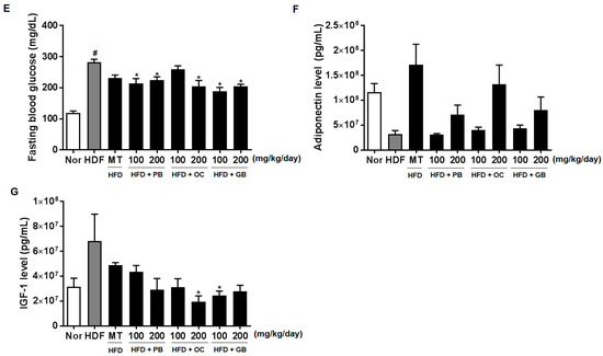 The effects of the PB, OC, and GB extracts on other serum parameters, such as LDL cholesterol, HDL cholesterol, FFAs, creatinine, fasting blood glucose, adiponectin, and IGF-1, were also investigated. As shown in Figure 5A–G, the increased levels of LDL cholesterol, FFAs, and blood glucose in the HFD mice were all significantly attenuated by PB, OC, and GB extract treatments. Although the serum creatinine and fasting blood glucose levels were increased by HFD, there were significant differences in their concentrations between the PB, OC, GB, and MT extract (100 mg/kg/day) groups and the HFD group (Figure 5D,E). In addition, the reduced serum adiponectin levels were markedly elevated by the PB, OC, and GB extracts (Figure 5F), whereas the HFD-related elevation of the serum levels of IGF-1 was suppressed by the PB, OC, and GB extracts in the HFD mice (Figure 5G).