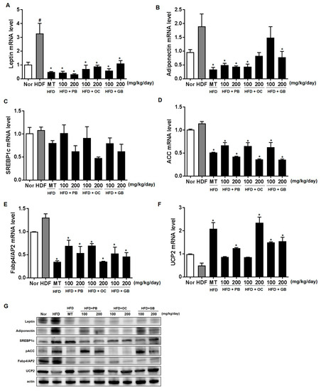 Effects of PB, OC, and GB extracts on the mRNA expression of lipogenesis-related genes in the liver of HFD-fed mice, determined by RT-PCR. Expression of (A) leptin, (B) adiponectin, (C) sterol regulatory element-binding protein-1 (SREBP-1), (D) acetyl-CoA carboxylase (ACC), (E) adipocyte protein 2 (AP2), and (F) mitochondrial uncoupling protein (UCP2) in the liver. (G) Western blot analysis of the corresponding proteins in HFD-fed mice livers. The data are presented as the mean ± SEM (n = 9); # p < 0.05 compared with the control group; * p < 0.05 compared with the HFD group.