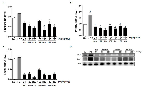 Effects of PB, OC, and GB extracts on the expression of lipogenesis genes in HFD-fed mice livers, determined by RT-PCR. (A) Fit2/Fitm2, (B) PPARγ, and (C) Fsp27/Cidec expression in the livers. (D) Western blot analysis of the corresponding proteins in HFD-fed mice livers. The data are presented as the mean ± SEM (n = 9); # p < 0.05 compared with the control group; * p < 0.05 compared with the HFD group.