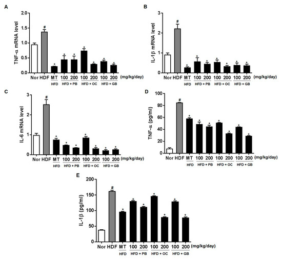 Effects of PB, OC, and GB extracts on the mRNA expression of inflammation-related genes in HFD-fed mice, determined by RT-PCR. (A) TNF-α, (B) IL-1β, and (C) IL-6 expression in the liver. Expression of (D) TNF-α and (E) IL-1β in the adipose tissue determined by ELISA assay. The data are presented as the mean ± SEM (n = 9); # p < 0.05 compared with the control group; * p < 0.05 compared with the HFD group.