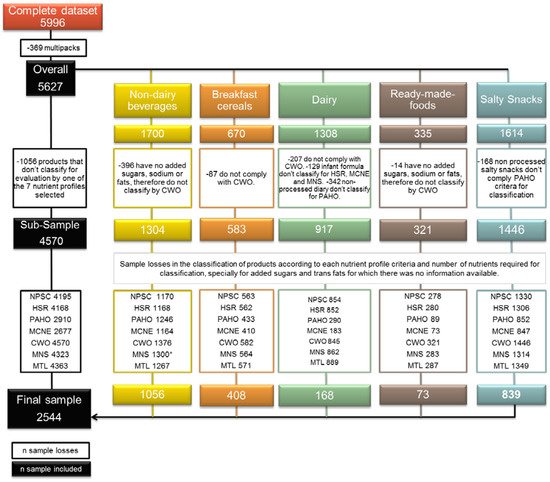 Dropouts of the sample. PAHO = Pan American Health Organization, HSR = Health Star Rating, MTL = Ecuador’s Multiple traffic light, MCNE=Mexican Committee of Nutrition Experts, MNS = Mexican Nutrition Seal, NPSC = Nutrient Profiling Scoring Criterion, CWO = Chilean Warning Octagons (Source: Elaborated by the authors).