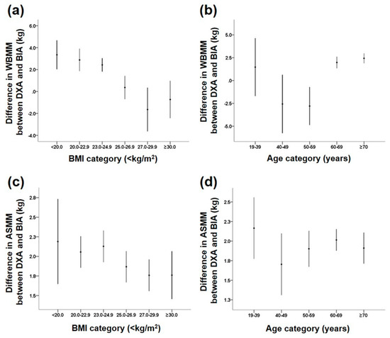 Differences in whole body lean muscle mass (WBMM) and appendicular skeletal muscle mass (ASMM) between DXA scans and BIA methods according to body mass index (BMI) and age categories. (a) WBMM by BMI group; (b) WBMM by age group; (c) ASMM by BMI group; and (d) ASMM by age group.