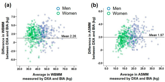 In our study, with a wide age range, the actual differences between BIA and DXA estimates ranged from −5.55 to 8.10 kg for WBMM. We found that the difference in estimating WBMM between the two methods was affected by BMI, gender, and body fat. For example, subgroups with a lower BMI showed larger differences in muscle masses compared with their counterparts with a higher BMI. East Asians tend to have a lower muscle mass but higher fat percentage than Europeans for the same BMI [36]. The gap between BIA and DXA in Asian ethnic groups seems to be greater than that in Europeans or Africans [37]. These data suggest that ethnicity should be considered in the interpretation of BIA methods. From a different aspect, considering that WBMM includes trunk mass, which comprises much of the total muscle mass, more precise assessments in the estimations of muscle mass in the trunk or abdomen are needed.