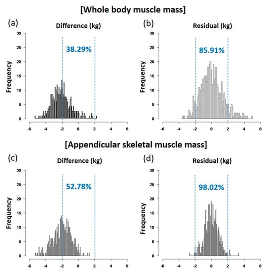 The strength of this study is that the number of study subjects was larger than in previous studies [15,16,17,31,32]. We included a much wider range of adults, aged from 28 to 89 years, and investigated ASMM as well as WBMM. To use the validation equation practically, we included variables that were relevant and easily accessible, such as age, gender, BMI, and body fat from the BIA measurements. With this simplified formula, we improved the accuracy of BIA in muscle mass assessment and minimized the percentage of residuals within 2 kg (Figure 3). This improvement in accuracy might be able to help researchers estimate muscle mass more accurately using BIA methods. In addition, we analyzed subgroups according to physiological and disease status, such as anemia, kidney function, DM, and medications such as diuretics or TZD, which were not considered in previous studies. We derived specific equations for ASMM as well as WBMM, which are critical in the diagnosis of sarcopenia [40,41].