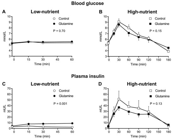 There was no significant difference in baseline (t = −2 min) plasma insulin on the four days–low-nutrient (without glutamine: 3.1 ± 0.62 mU/L, with glutamine: 4.3 ± 1.1 mU/L; p = 0.27) and high-nutrient drinks (without glutamine: 3.4 ± 0.49 mU/L, with glutamine: 3.7 ± 0.67 mU/L; p = 0.56).