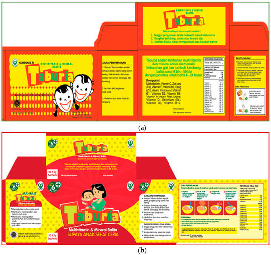 Packaging layout and messages (in Bahasa Indonesian) included in the box of Taburia containing 30 individual 1 g sachets. English translations of the messages are shown in the Supplementary Materials. (a) The original packaging approved by the Ministry of Health (MOH), decree number 2409 and enacted June 2011. (b) The improved packaging approved by the MOH, decree number 51 and enacted October 2016.