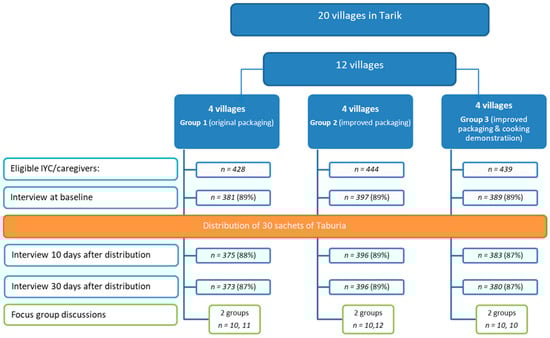 In this context, we sought to investigate the influence of improved information and educational messages on the outer packaging of Taburia (as described in the Supplementary Materials) and cooking demonstrations on knowledge and adherence to recommended use among caregivers of children aged 6–36 months old one month after distribution. A mixed-methods approach including a community-based cluster randomized control trial followed by FGD was used. We hypothesized that the improved packaging would improve preparation practices and yield higher adherence to prescribed use.