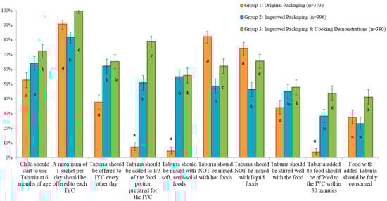 Caregiver knowledge regarding Taburia benefits and recommended use 30 days after distribution by study group. Group 1: Original outer packaging, as regulated by the MoH; Group 2: Improved design and messages content of outer packaging; Group 3: Improved outer packaging combined with cooking demonstrations. Error bars represent 95% confidence intervals. For all variables, differences between groups are statistically significant (p < 0.005) using a nested design, Generalized Linear Model (GLM) applying the Binomial distribution as base distribution via a Logit link function. Within a variable, values with different superscript letters are significantly different using Wald’s Chi-square adjusted for multiple comparisons (least significant difference) post-hoc analysis (p-value < 0.05).