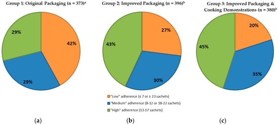Adherence to prescribed use of Taburia 30 days after distribution among children who consumed Taburia without sharing. Adherence was defined as “high” (13–17 sachets), “medium” (8–12 or 18–22 sachets) or “low” (≤7 or ≥23 sachets). (a) Group 1: Original outer packaging, as regulated by the MoH; (b) Group 2: Improved design and messages content of outer packaging; and (c) Group 3: Improved outer packaging combined with cooking demonstrations. Differences between groups are statistically different (p < 0.001) using multinomial distribution via Cumulative Logit function. Values with different superscript letters are significantly different using Wald’s Chi-square adjusted for multiple comparisons (least significant difference) post-hoc analysis (p-value < 0.05).