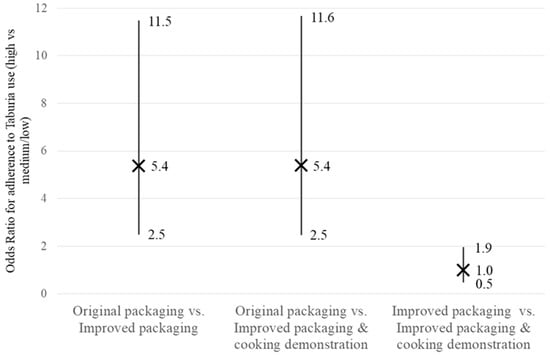 As shown in Figure 5, caregivers who received the improved packaging (with or without a cooking demonstration) were five times more likely [odds ratio 5.4 (2.5–11.5)] to have “high” adherence to prescribed use of Taburia (defined as 13–17 sachets versus fewer or more 30 days after distribution) when compared to those who received the original packaging. However, having participated in cooking demonstrations did not increase the likelihood of “high” adherence among caregivers who received the improved packaging [odds ratio 1.0 (0.5 to 1.9)].