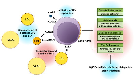 Cellular and systemic cholesterol metabolism play a significant role in the regulation of immune cell activity [25]. The majority of cellular cholesterol is located within the plasma membrane, particularly within cholesterol- and sphingomyelin-rich lipid raft regions [31]. Lipid rafts provide essential structure and scaffolding to allow for recruitment and signaling of immune receptors [23,32]. Cellular cholesterol depletion has been shown to disrupt raft stability and formation, as well as suppress toll-like receptor 4 (TLR4)- and T cell receptor (TCR)-mediated immune activation and pro-inflammatory signaling, whereas these processes are enhanced by cholesterol loading [33,34,35,36,37]. Lipid raft content and inflammatory activation of leukocytes may be further modulated through interactions with lipoproteins, which mediate cholesterol loading and efflux, serve as carriers of immunomodulating proteins, and directly interact with, and sequester, pathogenic stimuli [25]. Markers of cellular cholesterol metabolism and lipoprotein function have been found to be altered in models of infectious and chronic diseases, whereas lipid-lowering therapies have been shown to exhibit variable potential in the treatment of immune disorders [38]. The following sections highlight the role of lipid rafts and lipoprotein interactions in immunity.
