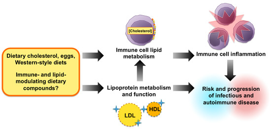 Overall, it is clear that cholesterol metabolism plays an important, yet complex and controversial role in the regulation of immunity and inflammatory disease risk (Figure 2). Consumption of dietary cholesterol, specifically coming from eggs, has been shown to modulate leukocyte cholesterol metabolism, lipid raft dynamics, and inflammatory potential, while additionally modulating lipoprotein profiles and markers of HDL function [24,101]. Interestingly, evidence from human studies suggests that these pathways are affected by cholesterol dose and metabolic status, suggesting that efficiency of dietary cholesterol absorption, the presence of insulin resistance, and weight loss can impact the immunomodulatory response to exogenous cholesterol [105,106,108,110]. Research from animal and human studies further demonstrates that cholesterol-rich dietary patterns differentially impact pathophysiology and clinical outcomes of distinct infectious diseases by various bacterial and viral pathogens, and that dietary cholesterol may either exasperate or mitigate autoimmune dysfunction [26,100,133,135,168,169]. However, further human studies and clinical trials are required to determine whether altered leukocyte cholesterol metabolism, lipoprotein profiles, or metabolic status underlie the variable effects of cholesterol-rich diet intake on infectious and autoimmune disease pathophysiology. It is additionally essential to elucidate the contributions of confounding dietary bioactives in these pathways, and evaluate whether other functional foods known to modulate lipid metabolism can impact immunity via similar mechanisms. Together, the findings presented in this review highlight a significant role for dietary cholesterol in human health beyond the scope of cardiovascular disease.