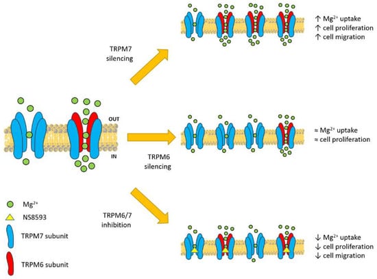 - Ferioli, S.; Zierler, S.; Zaißerer, J.; Schredelseker, J.; Gudermann, T.; Chubanov, V. TRPM6 and TRPM7 differentially contribute to the relief of heteromeric TRPM6/7 channels from inhibition by cytosolic Mg2+ and Mg·ATP. Sci. Rep. 2017, 7, 8806. [Google Scholar] [CrossRef] [PubMed]
