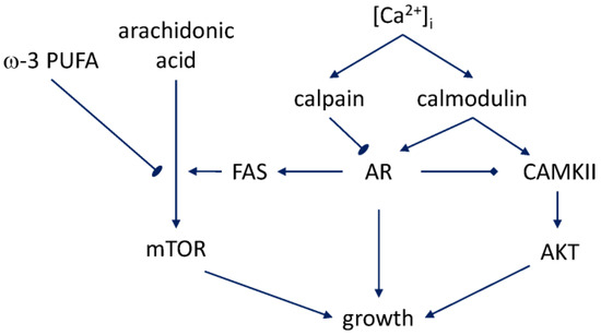 Recent work has begun to clarify the mechanisms of bidirectional regulation that connect androgen signaling with fatty acid metabolism (Figure 1). The basis for this interaction network was identified in the study of the expression and activity of fatty acid synthase (FAS), the enzyme that is upregulated in prostate cancer and associated with disease grade [70]. In androgen-responsive prostate cancer cells, including those with aberrant androgen sensitivity, androgen stimulation was found to lead to a significant upregulation of FAS on the mRNA level and an even larger increase of the enzyme’s activity [71]. The FAS upregulation precedes the characteristic accumulation of lipid droplets in the prostate cancer cells [72]. Lipid droplets are an important functional marker because of their involvement in fatty acid-regulated cholesterol metabolism, which, in turn, impinges on AR signaling. As sites of cholesterol ester storage, in vivo they demarcate advanced prostate cancer, and in vitro, the cholesterol ester-rich androgen-independent and high-passage prostate cancer cells [73]. Such cells, the same recent work has shown, no longer exhibit the key step in androgen signaling—nuclear translocation of AR. The dominant species in the lipid droplets is cholesteryl oleate. However, depletion of cholesterol ester in these experiments caused an inhibition of uptake of arachidonic acid as well, and was causative of the diminished aggressiveness that was seen in xenografts. The mechanism leading to the cholesterol ester accumulation downstream of the PTEN loss, which is characteristic of prostate cancer cells, involves, according to this study, the PI3K/AKT/mTOR pathway. This finding dovetails with the earlier result that ω-3 fatty acids counteract the effect of arachidonic acid and inhibit progression to hormone independence via suppression of mTOR signaling [74].