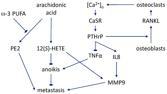 It should be noted, in particular, that the anti-apoptotic effect of arachidonic acid on prostate cancer cells [163,164] is connected with the activity of 5-lipoxygenase and production of 5(S)-hydroxyeicosatetraenoic acid (5(S)-HETE) and 5-oxo-eicosatetraenoic acid (5-oxo-ETE). These effects were consistent with the earlier finding of the 5-lipoxygenase-dependent promotion of prostate cancer cells’ proliferation by arachidonic acid [165]. The differential expression of 5-oxo-ETE receptor in prostate cancer cells [166] enables transmission of the signal to these downstream effects through phospholipase Cβ and diacylglycerol and protein kinase Cε [167,168]. Interestingly, the most recent work shows that testosterone can bind the same receptor and antagonize some the effects of 5-oxo-ETE [169]. Although the above-described growth and anti-apoptotic effects were not mediated by the products of 12-lipoxygenase, the latter pathway also plays a variety of roles in prostate cancer, including the 12(S)-HETE mediated secretion of MMP9 and VEGF [170,171,172]. Of special relevance to the acquisition of the distant-metastatic phenotype by prostate cancer cells is the effect of 12(S)-HETE whereby it suppresses [173] the detachment-induced apoptosis (anoikis, whose mechanisms will be further reviewed in Section 6.3).