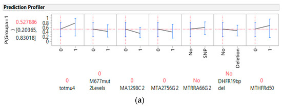 Genes involved in the prediction of colorectal cancer: (a) per single gene profiler, total polymorphism score and total methylenetetrahydrofolate reductase (MTHFR) enzyme deficiency (calculated based on MTHFR 677 and 1298 (presented as M677mut 2Levels and MA1298C 2) polymorphism mutation alleles), (b) interaction profilers of selected gene parameters and colorectal cancer. Note that the MTHFR 677 polymorphism status (0 or 1) overlapped with no discrimination against other genetic factors in regard to its association with cancer risk; p(Groupa) = 1 is the probability of predicting a level 1 (cancer status versus 0, the control status) response, MTA2756G 2: methionine synthase A2756G in 2 levels, MTRRA66G 2: methionine synthase reductase A66G in 2 levels, DHFR19bp del: dihydrofolate reductase 19 base pair deletion, MTHFRd50: MTHFR enzyme deficient 50% or higher.