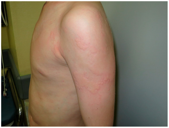 Urticaria is characterized by the onset of wheals, angioedema, or both (Figure 1) [29]. Urticaria is a common disorder, occurring in 15–25% of individuals at some point in life [29,30]. Chronic urticaria (CU) (duration ≥6 weeks) is seen in about 0.5–1% of the general population [31,32]. CU is associated with a substantial decrease in quality of life [31]. The etiopathogenesis of CU is thought to be associated with autoimmune mechanisms [33,34,35,36]. CU has been shown to have a genetic association with the human leukocyte antigen HLA-DQ8 alleles [37]. Interestingly, HLADQ8 has an association with CD [37,38].
