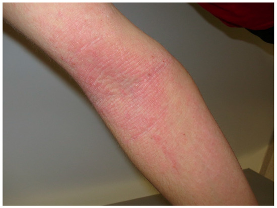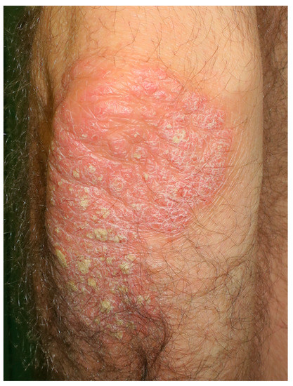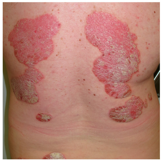 Psoriasis is an autoimmune chronic inflammatory skin disease with an estimated prevalence of 2–4% in the adult population [61,62]. It affects over 7.5 million people in the United States and approximately 125 million people worldwide [54]. Psoriasis is considered to be a multifactorial disease, in which the genetic background interacts with environmental factors to define an individual’s risk [62,63,64]. The classical clinical manifestations of psoriasis consist of the presence of red, infiltrated plaques, covered with a coarse, silvery scaling (Figure 3 and Figure 4). Predilection sites include the elbows and knees, scalp, and periumbilical and lumbar regions, although any anatomical site might be affected [65]. The clinical course of psoriasis is marked by frequent relapses with fluctuating rates [62].