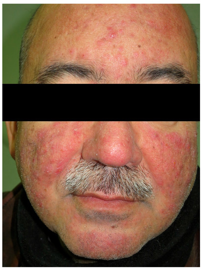 Rosacea is an inflammatory skin condition characterized primarily by persistent or recurrent episodes of centrofacial erythema, with women being more affected than men [100] (Figure 6). The pathophysiology is not completely understood, but dysregulation of the immune system as well as changes in the nervous and vascular systems have been identified [101]. Rosacea can seriously affect a patient’s quality of life, and this should prompt clinicians to diagnose it early and start treatment [100]. Rosacea shares genetic risk loci with autoimmune diseases, such as type 1 diabetes mellitus and CD [102]. One study showed that women with rosacea had a significantly increased risk of CD (OR = 2.03, 95%CI 1.35–3.07) [103]. In a nationwide cohort study, the prevalence of CD was higher among patients with rosacea when compared to control subjects (HR = 1.46, 95%CI = 1.11–1.93) [19]. In this study, rosacea was associated with an increased prevalence of Crohn’s disease, ulcerative colitis, irritable bowel disease, small intestinal bacterial overgrowth, and Helicobacter pylori infection.