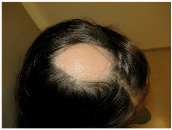 AA is an autoimmune disease that presents as a non-scarring type of hair loss. AA affects both sexes equally, affects patients of all ages, and is found in approximately 2% of the general population [104]. Clinical presentation of AA is very heterogeneous, ranging from small and well-circumscribed patches of hair loss to a complete absence of body and scalp hair (Figure 7). Exclamation point hairs, dystrophic hairs, and yellow dots are features of AA that can be identified with trichoscopy. Nail abnormalities, such as pitting, brittleness, or striations are seen in 10% to 20% of patients. The main factors affecting prognosis include age at onset and disease extent; younger age at initial presentation and severity at onset are the most important prognostic indicators [105]. The etiology of AA remains unclear, though it is believed to result from a loss of immune privilege in the hair follicle, autoimmune-mediated hair follicle destruction, and the upregulation of inflammatory pathways [105].