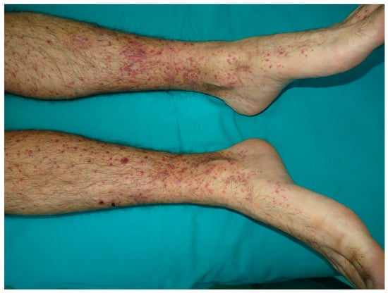 Leukocytoclastic vasculitis, also known as “hypersensitivity vasculitis”, is a histopathologic diagnosis given to cutaneous, small vessel vasculitis, characterized by the inflammation of the walls of postcapillary venules [113]. The clinical features of leukocitoclastic vasculitis include palpable purpura, nodules, hemorrhagic vesicles, bullae, and livedo reticularis, mainly distributed in the lower extremities (Figure 8) [114]. Extracutaneous involvement is seen in approximately 30% of patients. Systemic vasculitis shows a predilection for certain organs, such as the kidneys and lungs. In most cases, leucocytoclastic vasculitis is mediated by immunocomplex deposition, with the antigen being either exogenous or endogenous [115,116,117,118].