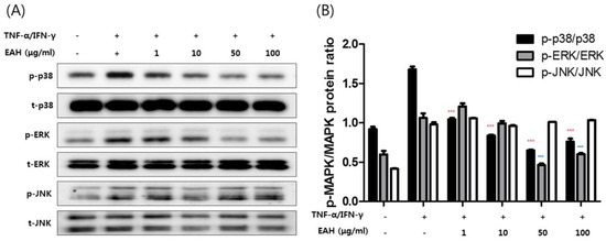 Protein expression was evaluated by Western blot analysis according to standard procedures. The cells (1 × 106 cells/well) in 6 well plates were pretreated with EAH at various concentrations (1 μg/mL, 10 μg/mL, 50 μg/mL, and 100 μg/mL) for 1 h and stimulated with TNF-α/IFN-γ (each 10 ng/mL) for 30 min at 37 °C in a 5% CO2 atmosphere. The primary antibodies (p38; p-p38 (Thr180/Tyr182); ERK1/2; p-ERK1/2 (Thr202/Tyr204); JNK; p-JNK (Thr183/Tyr185); STAT-1; p-STSA-1(Tyr701); IκBα; β-actin) and secondary antibodies (anti-rabbit (#7074); anti-mouse (#7076)) were obtained from Cell Signaling Technology (Boston, MA, USA). The Western blot was performed according to a previously described method [10].