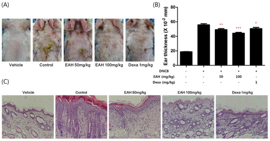 Repeated cutaneous application of DNCB induces AD-like dermatitis in BALB/c mice. We investigated EAH following induction using DNCB of AD-like mouse skin lesions. As shown in Figure 5A, the skin conditions significantly prevented the EAH-administered groups relative to those in the control group. In addition, EAH prevented DNCB-induced ear thickness and dorsal skin thickness in a dose-dependent manner.