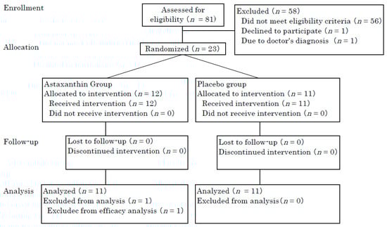 Eighty-one participants were recruited from the Osaka area and twenty-three participants (age ranging from 30 to 56 years, 21 females and 2 males) were enrolled. These participants were assigned to the astaxanthin group (n = 12) or placebo group (n = 11). All participants finished the study. One participant in the astaxanthin group was excluded from the analysis because of an aberrant serum bilirubin level before and after supplementation (Figure 1). Finally, 22 participants (age range from 30 to 56 years, 20 females and 2 males) were analyzed. Thus, the per protocol set analysis was performed. No statistically significant differences were observed for baseline scores including age, gender, MED and moisture and TEWL at the non-irradiated area between the originally included participants and finally analyzed participants. The participants were recruited from September to October 2017. This study consisted of a 9-week administration period from October to December 2017. The placebo group and astaxanthin group were matched according to age, gender, MED, and moisture and TEWL at the non-irradiated area (Table 1). The mean compliance was 100 ± 0% and 99.5 ± 1.7% in the placebo and astaxanthin groups, respectively. All subjects had a >94% ingestion rate. No statistically significant differences were observed for ingestion rate between the groups.