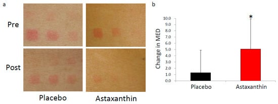 Figure 2. Dietary supplementation with astaxanthin increases the minimal erythema dose. (a) Representative imaging of an irradiated area in the placebo group (left) and astaxanthin group (right) before and after supplementation; (b) Change in MED from baseline in the placebo group (black) and astaxanthin group (red). * p < 0.05 by Mann–Whitney U-test. Error bars indicate the standard deviation (SD).