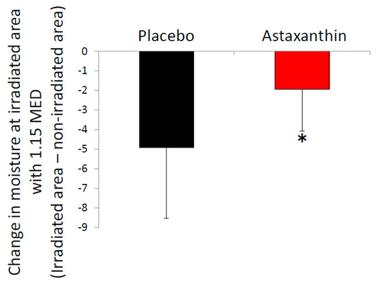 Figure 3. Dietary supplementation with astaxanthin attenuates the decrease of moisture at the irradiated area. Change in moisture from baseline at the irradiated area 7 days after irradiation. The moisture levels at the irradiated area were normalized by those at the non-irradiated area. * p < 0.05 by unpaired t-test. Error bars indicate the SD.