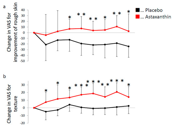 Figure 4. Subjective skin conditions “improvement of rough skin” and “texture” are improved by dietary supplementation with astaxanthin. Change in VAS score for “improvement of rough skin” (a) and “texture” (b) from baseline at the non-irradiated area in the placebo group (black) and astaxanthin group (red). Positive and negative numbers indicate improvement and deterioration, respectively. * p < 0.05, ** p < 0.01 and *** p < 0.001 by unpaired t-test. Error bars indicate the SD.