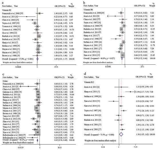 Forest plots summarizing the OR of EC for the highest vs. the lowest category of (a) vitamin B2 intake; (b) vitamin B6 intake; (c) folate intake; and (d) vitamin B12 intake. OR: odds ratio (relative risk); CI: confidence interval.