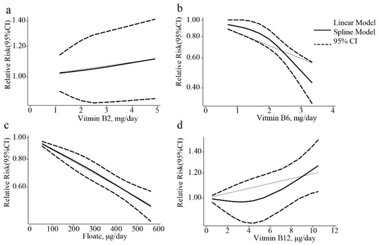 Dose-response relationships between EC risk and the daily intake of (a) vitamin B2; (b) vitamin B6; (c) folate; and (d) vitamin B12. In each panel, the solid line and dashed lines represent the estimated relative risk and 95% confidence interval, respectively, and the dotted line represents the linear fit to the data.