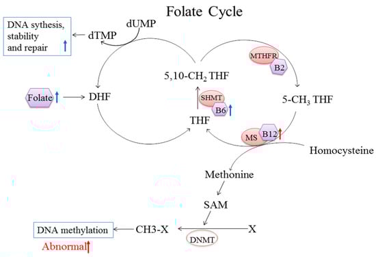 Schematic model of the folate-mediated one-carbon metabolism pathway and its relationship with methylation reactions. Folate undergoes two reduction steps to produce THF. Vitamin B6 serves as a co-factor of SHMT to catalyze the synthesis of 5,10-CH2 THF. Vitamin B2 serves as a precursor of the co-factor for MTHFR to produce 5-CH3 THF. The vitamin B12-dependant enzyme MS uses 5-CH3 THF to convert homocysteine to methionine, the precursor of SAM. Finally, SAM mediates various methylation reactions. The blue arrows indicate that high intake of vitamin B6 and folate leads to increased DNA synthesis, stability, and repair. The red arrows indicate that high intake of B12 is associated with abnormal DNA methylation. Abbreviations: DHF, dihydrofolate; THF, tetrahydrofolate; 5-CH3 THF, 5-methytetrahydrofolate; 5,10-CH2 THF, 5,10-methylene tetrahydrofolate; MTHFR, methylene tetrahydrofolate reductase; SHMT, serine hydroxymethyltransferase; MS, methionine synthase; SAM, S-adenosylmethionine; DNMT, DNA methyltransferase.