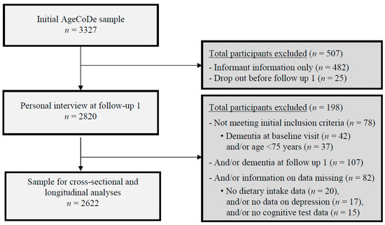 For the present study, we used data of participants who attended the first follow-up (FU-1) visit because information on food intake was collected at FU-1. Of the 3327 participants investigated at baseline, we excluded participants with FU-1 informant-based information only (n = 482) and participants that were lost to follow up before the first follow up visit (n = 25), resulting in a sample of 2820 participants at FU-1. From these 2820 participants, we further excluded in total 198 participants who, at baseline, received a study diagnosis of dementia (n = 42) or were aged below 75 years (n = 37; falsely classified as 75 years or older in the study selection process) as well as those participants with dementia at FU-1 (n = 107), and/or those participants whose dietary intake data (n = 20) and/or data on depression (n = 17), and/or cognitive data (data on the Consortium to Establish a Registry for Alzheimer’s Disease (CERAD); n = 15) was not available at FU-1. Consequently, the sample of non-demented participants with complete cognitive test data at FU-1 included 2622 participants. The exclusion of participants of the present study is shown in a flow chart (Figure 1).