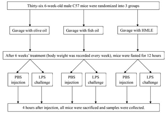 The experiment was performed as a 3 × 2 factorial design with the main factors being gavage treatment and the LPS challenge. After one week of adaption, mice were randomly assigned to 3 groups (n = 12 per group) including the solvent control group, the fish oil control group, and the HMLE group. The solvent control group received olive oil by gavage at a volume of 5 mL/kg body weight daily [18]. Olive oil was commonly chosen as the solvent for mussel lipid extracts [6,19,20]. Fish oil and HMLE groups received the same volume of olive oil containing fish oil and HMLE, respectively. The dose of HMLE and fish oil was 300 mg/kg (around 6–8 mg/mouse). This dose was adapted from a previous study where the New Zealand green-lipped mussel lipid extract (GMLE) was administrated to mice with inflammatory bowel disease at a dose of 5 mg/mouse. It concluded that the optimal dose might not have been achieved [20]. The fish oil group was selected as a positive control since it has already been shown to enhance intestinal integrity in weaned pigs after the LPS challenge [21]. The fatty acid profile of olive oil, fish oil, and HMLE used in this study is shown in Table 1. The calculated n-3 fatty acid dose of three groups are 26.1 mg/kg (olive oil as linolenic acid), 208.7 mg/kg (fish oil, mainly EPA and DHA), and 124.2 mg/kg (HMLE, mainly EPA and DHA).