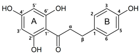 The natural flavonoid phloretin (3-(4-hydroxyphenyl)-1-(2,4,6-trihydroxyphenyl)-1-propanone) (Figure 1) is a dihydrochalcone, which has A and B two rings with flexible linkage and is abundant in the fruit peel and healthy leaves of the apple (Malus pumila) in its free and glucosidic forms: phloridzin and phloretin 2′-O-glucose, respectively []. Phloretin is a dietary flavonoid with various bioactive properties, including antioxidant effects [], protection of the skin from ultraviolet light-induced damage [], anticancer activity [], antibacterial activity [,], and prevention of cardiovascular disease []. In addition to these activities, phloretin has been shown to suppress the production of inflammatory mediators such as cytokines, chemokines, and differentiation factors induced by leukocytes, which are stimulated during the innate immune response []. TLRs are expressed by cells within the joints of patients with RA, and TLR2 activation was reported to induce migrational and invasive mechanisms, which are critically involved in the pathogenesis of RA [,]. Furthermore, phloretin was shown to reduce the damage in a collagen-induced arthritis mouse model by inhibiting several proinflammatory cytokines []. However, the inhibitory mechanism of phloretin remains unknown. Since TLR2 is a potential therapeutic target for the treatment of various kinds of inflammatory diseases, the detailed mechanism and involvement of TLR2 in the effects of phloretin on such inflammation suppression should be elucidated. Therefore, in the present study, we investigated whether the inhibitory effect of phloretin is mediated via TLR2 signaling through preventing the heterodimerization of TLR2/1 or TLR2/6.