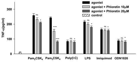 Specificity of phloretin with various TLR-specific agonists that selectively activate different TLRs determined by monitoring the inhibition activity of TNF-α production in Raw264.7 cells. Pam3CSK4 (200 ng/mL), Pam2CSK4 (200 ng/mL), poly(I:C) (1 µg/mL), LPS (20 ng/mL), imiquimod (1 µg/mL), and ODN1826 (10 µg/mL) were used to selectively activate respective TLRs. TNF-α secreted into the supernatant was measured by ELISA. Each sample was measured in triplicate. The error bars represent ± SEM. (* p < 0.05; *** p < 0.001). n.s. represents no significance, tumor necrosis factor (TNF), Toll-like receptors (TLRs), lipopolysaccharide (LPS), standard error of measurement (SEM).